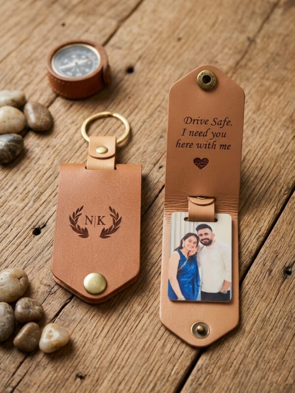 Made with premium PU leather, this personalised keychain features dual-side engraving: a treasured photo on one side and a custom engraving, name, or message on the other.